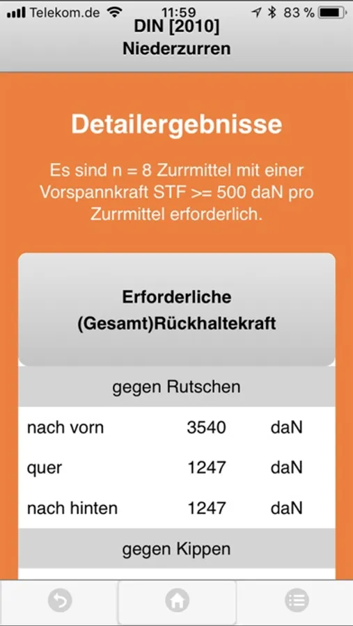 - das Ergebnis wird detailliert gegen Rutschen und Kippen in alle Richtungen angezeigt