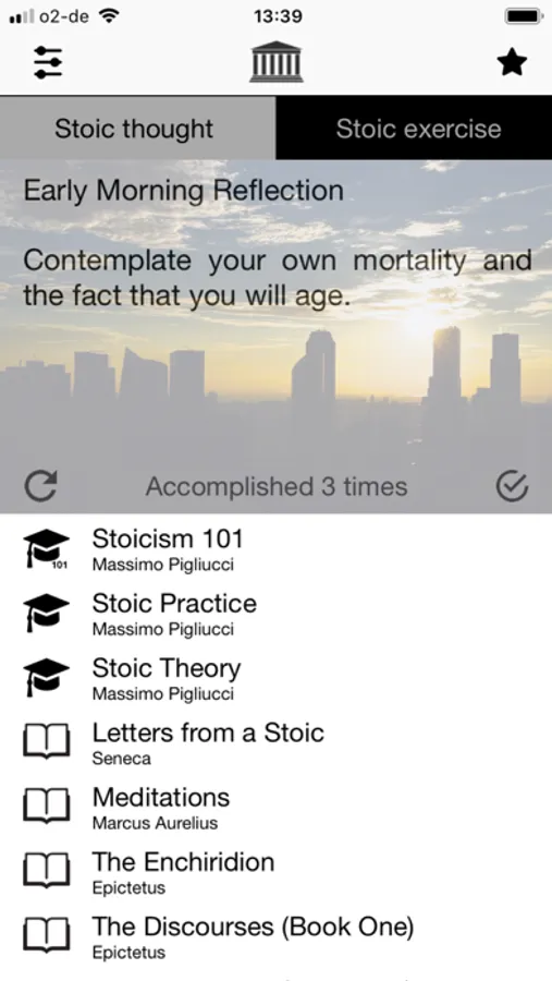 - Stoic exercises: wisdom is knowledge put into practice. Do stoic exercise and collect accomplishment points.