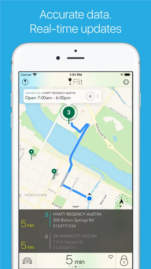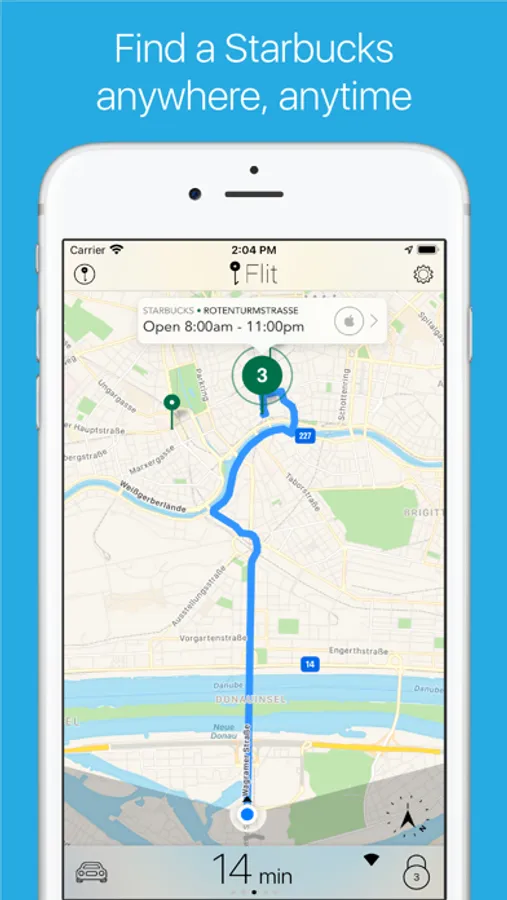 Open Flit and instantly find the nearest Starbucks stores along with detailed routes and travel times.