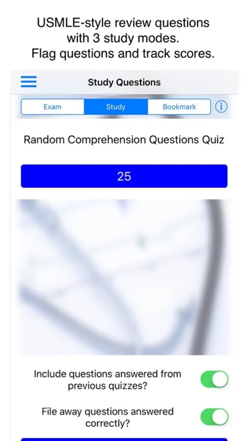 -Study/Exam/Bookmark modes are available for board-style review questions.