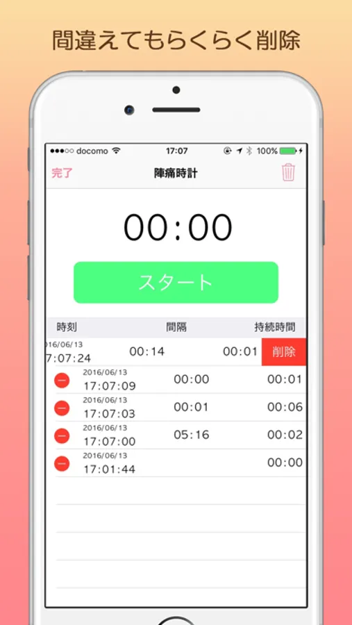 記録は1件でも一括でも削除でき、陣痛の記録を簡単に整理できます