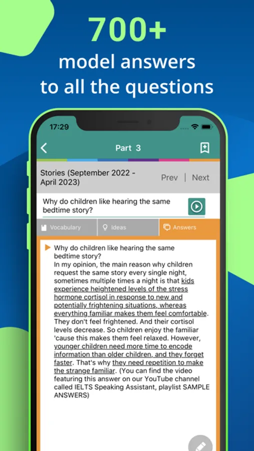 • You will get fully prepared for your speaking test without wasting your time on searching for questions and ideas and model answers. Just learn everything that's in the app and you will never dry up in the middle of your speaking test