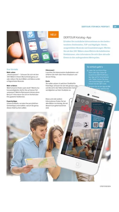 So funktioniert es: Öffnen Sie den aktuellen DERTOUR Städtereisen-Katalog bzw. den DERTOUR Katalog Freizeit- und Ferienparks. Auf Seite 12 bzw. Seite 18 erhalten Sie mehr Info zur App. Installieren Sie gratis die DERTOUR Katalog App und scannen Sie eines der Bilder im Katalog, die mit einem Smartphone-Symbol gekennzeichnet sind.