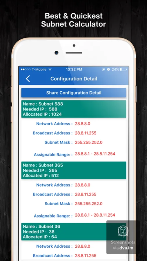 - Get complete Network Configuration with Assignable IP Range, Subnet Mask, Network Address and Broadcast Address for each Subnet