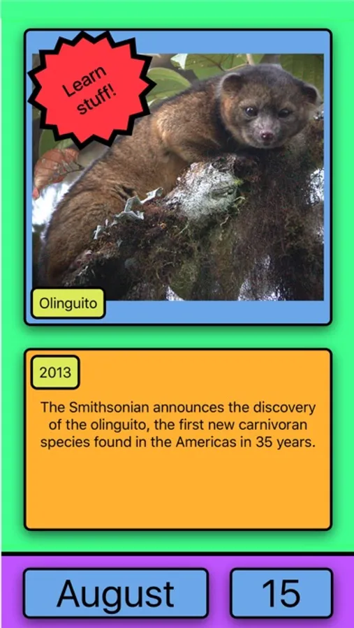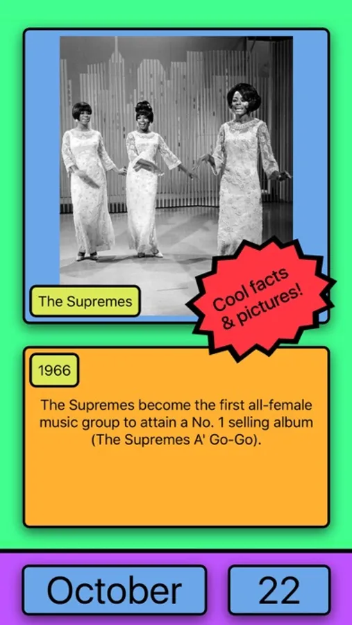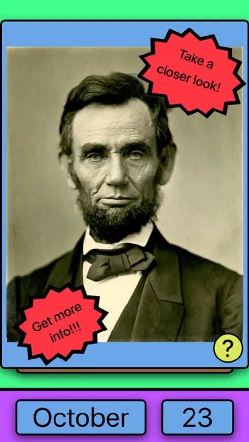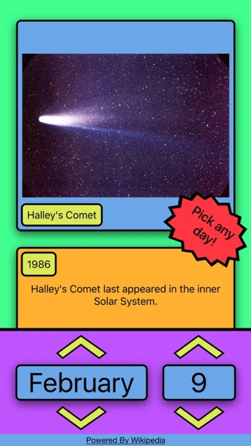 Swipe through dozens of facts for every day, and tap pictures to take a closer look! The question mark button makes it easy to follow your curiosities to Wikipedia (where they so often lead). When you're done with those facts, tap the date to pick a new day. The app is both easy and enjoyable to use, perfect for quenching your thirst for knowledge every day!