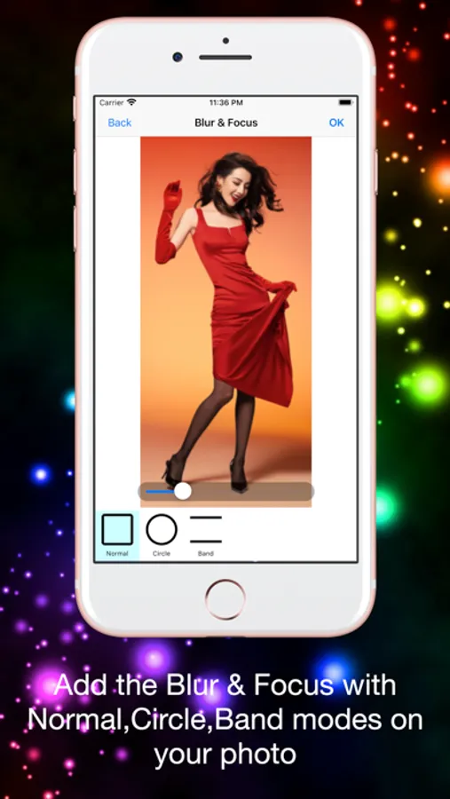 • Blur and focus your photos and backgrounds in Normal, Circle, and Horizontal Line modes.