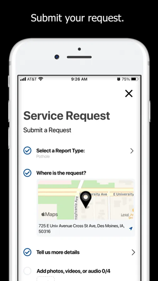 Report problems where and when you find them! With myDSMmobile, you can reach out to your City government right from the palm of your hand. Use your smartphone to report any of the most common complaints or services with GPS-enabled photo or video built right in. Keep track of requests for service and problem complaints in your neighborhood with real-time updates online. Remember, a geo-coded picture's worth more than a thousand words!