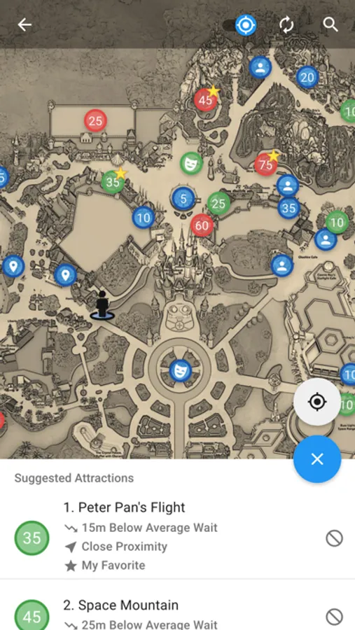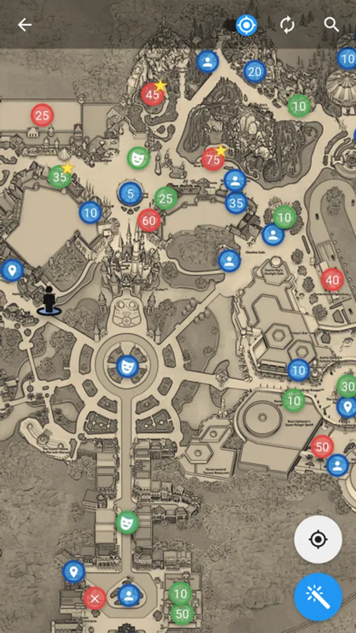 Merlin's Magic Map is a real-time touring plan with current and and historical wait times for Walt Disney World amusement park, including Magic Kingdom, Epcot, Disney Hollywood Studios, and Animal Kingdom. It displays attractions, meet'n greets, shows, and parades on a single map with a simple color-coded system that breaks each item into good or bad use of your time, provides walking directions, and even suggests what to do right now. Ask yourself a few questions. Do you know if an attraction's current wait time is above or below average? Would you know when a show or parade was about to start, right around the corner from where you are standing? Do you know quickly when an attraction is closed or the exact minutes until a show begins? Can you look at all the information about shows and rides and figure out what's the best use of your time right now? Overwhelmed? You don't have to be with Merlin's Magic Map by your side. Simply open it on your smartphone and let it do all the work.