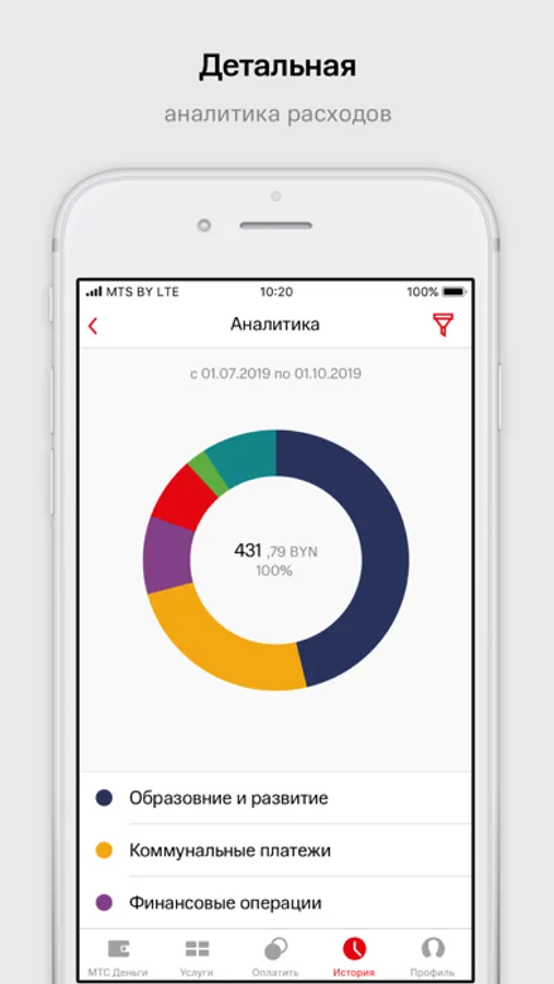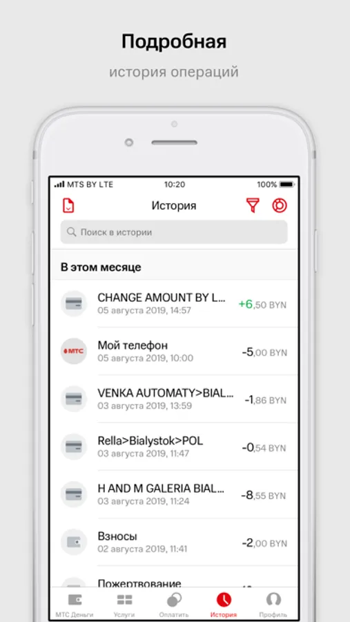 • просматривать единую историю транзакций, анализировать расходы, а также формировать выписку по своему абонентскому счету, включая расходы на услуги связи за любой период времени;