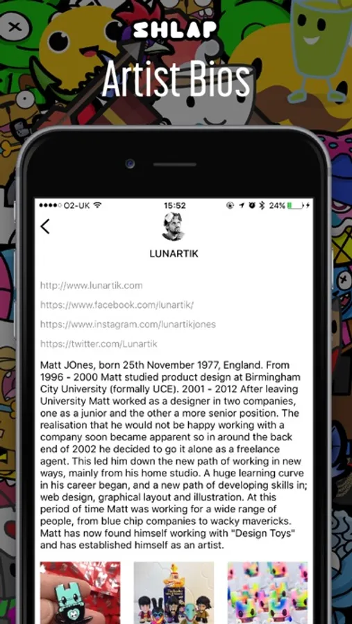 Artist Bios: Find out more about your favourite artists in their bio page, view images of their work and see all of their available sticker packs. Plus find links to their websites and social media pages.