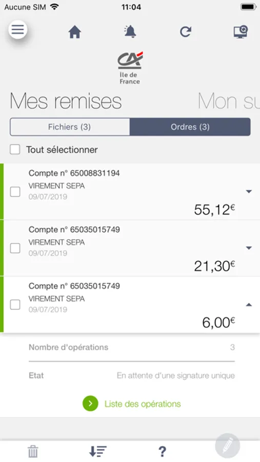 • consultation par l’Utilisateur des ordres ou fichiers EDI en attente de sa signature électronique (signature unique ou première co-signature ou deuxième co-signature). S’il est habilité, l’Utilisateur peut également consulter le détail des opérations de chaque ordre en attente de sa signature électronique.