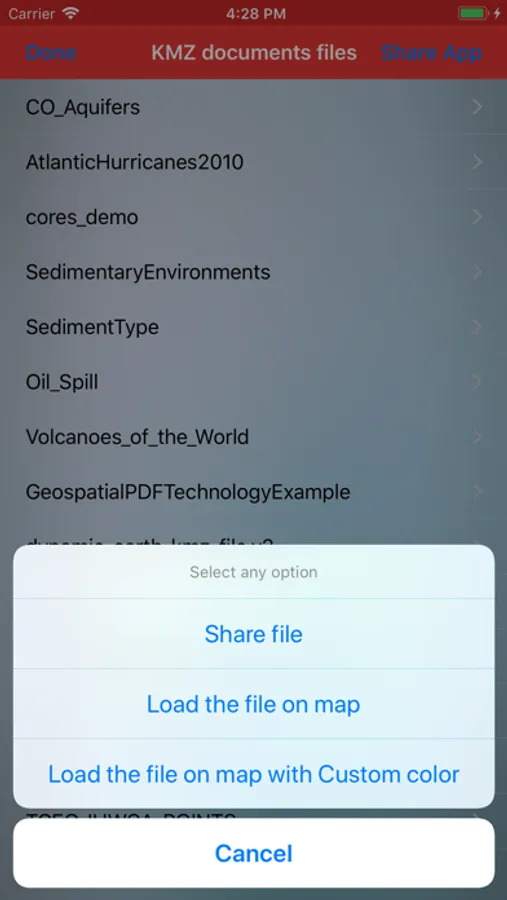 —>Tap on the file in Document folder to Share or export the kmz files to another application