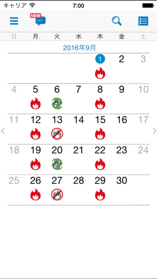 今日と明日、週ごと、月ごとの3パターンによるごみ収集日程を一つの画面ですぐに確認することができます。