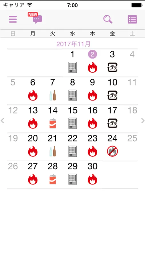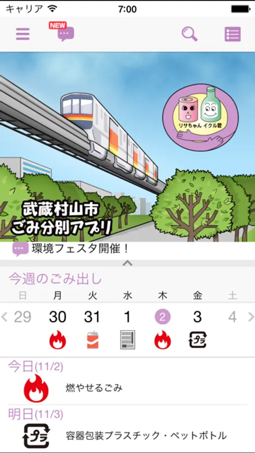 収集日変更のお知らせやイベント情報などを確認することができます。