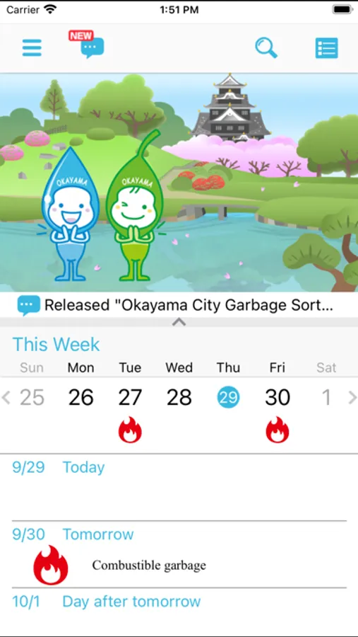 Okayama City has released an app which includes information related to garbage, such as the garbage collection schedule, the procedures for disposing of garbage, precautions to take when disposing of garbage, a garbage sorting reference, and frequently asked questions. You can check the information easily with your smartphone.
