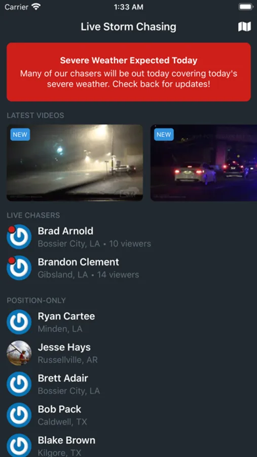 Not only can viewers see live storm chasers take to the storms for the best shots and angles, they can also talk with other viewers through our built-in chat, view the chasers current position and heading on an interactive map, see live weather radar and warnings, and communicate with the chasers themselves!