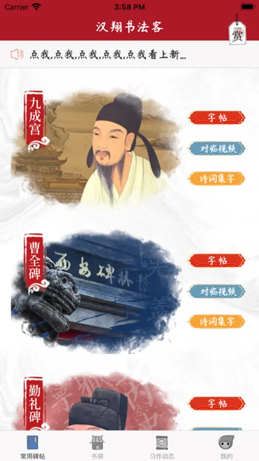 各类实用课程,你想正襟危坐学习技法还是躺着学习如何欣赏作品都可以;持续更新的多体名家书法诗词集字,你每日都有新内容可以参考;分类别的高清名帖,以后再也不用买字帖了;保存练习结果,方便查询、对比以及向亲朋好友分享成果。强大的功能不仅如此,快来体验吧!