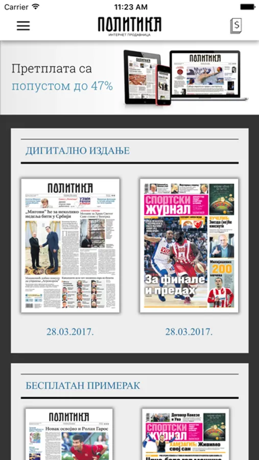 Aplikacija sadrži mogućnost kupovine pretplata za novine Politika i Sportski žurnal, koje se automatski produžavaju. Pred istekom pretplate korisnik će biti obavešten o tome i imaće mogućnost otkazivanja pretplate. Ukoliko ne otkažete pretplatu najmanje 24 časa pre isteka, nova će vam biti naplaćena prema važećem cenovniku. Iznos kupovine biće naplaćen putem vašeg iTunes naloga. Automatsko produžavanje pretplate možete isključiti i u korisničkim podešavanjima iTunes naloga (Account settings).