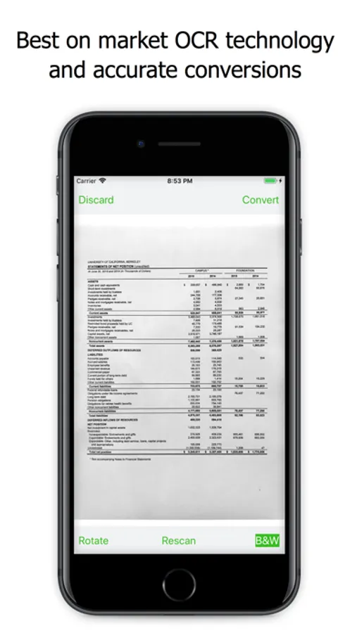 Take a photo of your paper or on-screen document and convert it to editable Microsoft Excel document (xlsx) right on your iPhone or iPad using our quick and easy-to-use app. Our industry-leading OCR engines will spare you from wasting your time and effort for retyping whole tables, receipts, invoices, notes, lists and other documents. Instead of using scanner and then converting your scan to editable document - let our app to do the job for you.