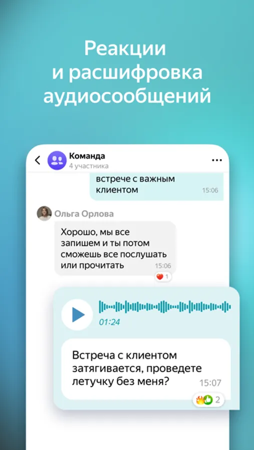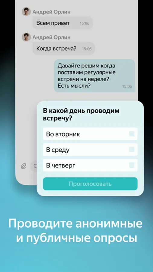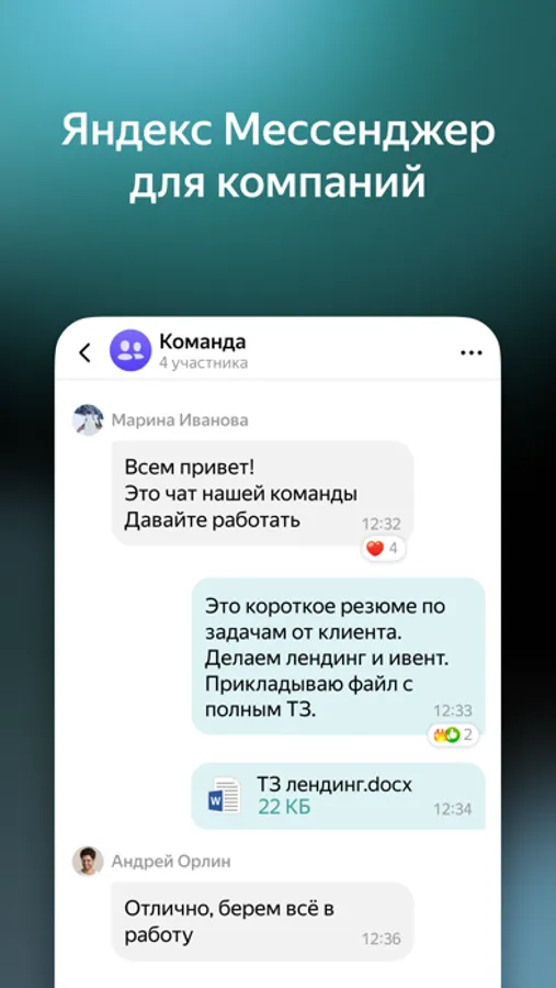 Yandex Messenger is a secure corporate messenger with a familiar interface. We've combined important messenger functions and added the features necessary for working in any business, such as inviting teams or departments to a group chat.