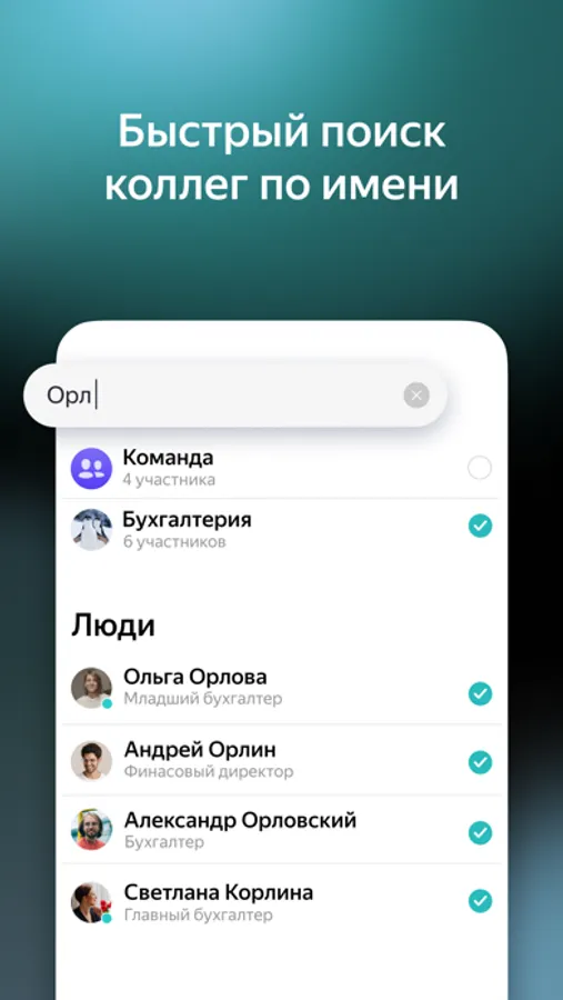 • Quickly search for colleagues by name: company employees will automatically appear in Yandex Messenger from the company's contact book.