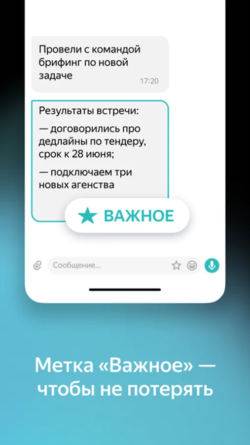 • There's no more confusion between business and personal messages. No one else can read your chats: all Yandex Messenger data stays inside the company, allowing you to work more efficiently with NDA material.