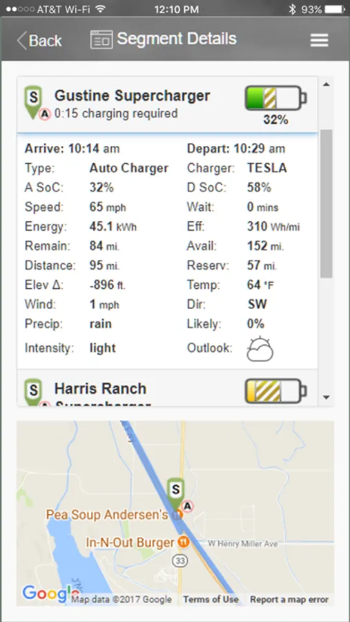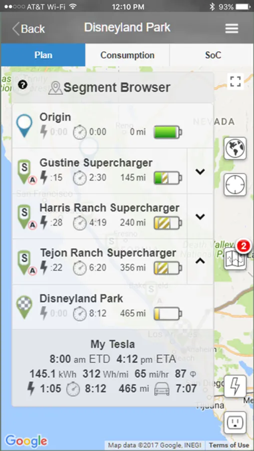 The application takes into account your car's characteristics such as model, battery, charger, wheels, motors and tires along with your driving style. During planning the application collects enroute weather, determines elevation gains/losses, uses wind speeds, temperatures, estimated speed, charging capabilities and your state of charge to help you discover the optimal trip with the least amount of total time expended.