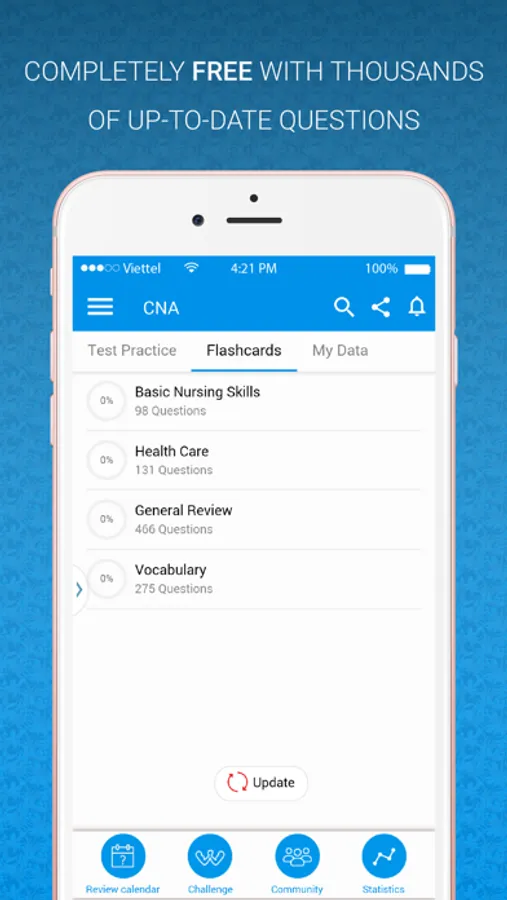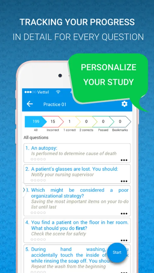 CNA practice test is a great way to help you prepare for CNA exam. We offer studying tools for any subjects, purpose learning materials for everyone from everywhere. Instead of the traditional learning with books, the brain is also challenged via our several learning modes: Study, Slide show, Matching, Memorize, Quiz to make the process for you study more exciting and fun.