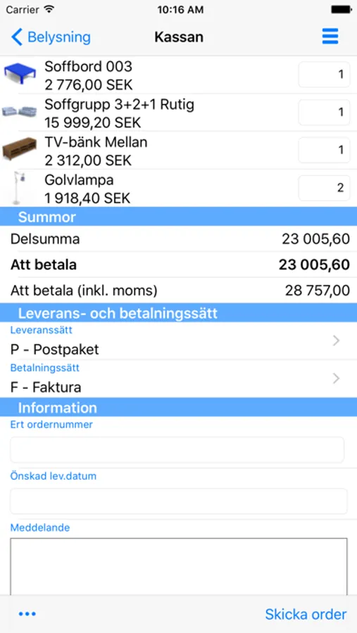Använd appen som ett elektroniskt orderblock där du kan registrera beställningar löpande. Naturligtvis kan du även lägga in beställningar i ditt orderblock offline.