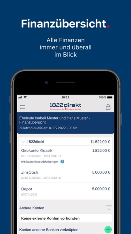 Eine App für alles: Zur 1822direkt Banking-App können Sie alle Konten hinzufügen, auch die von anderen Banken. Das sorgt für optimalen Überblick – über Ihre gesamten Finanzen.