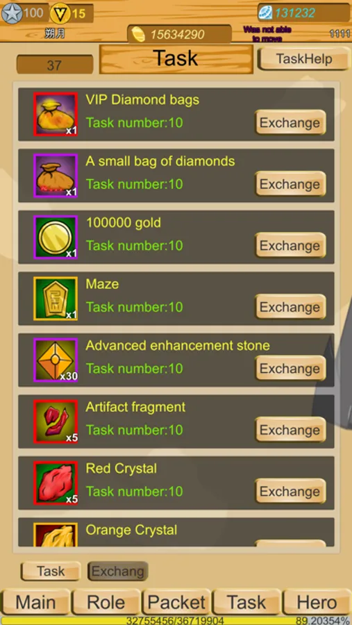 *When there are new tasks, simply clear them first, and the level will rise as they are being done. Sometimes they will get stuck in a relatively difficult task and improve their combat power before completing it. You can exchange VIP diamond, treasure, artifact and so on when you get task points.