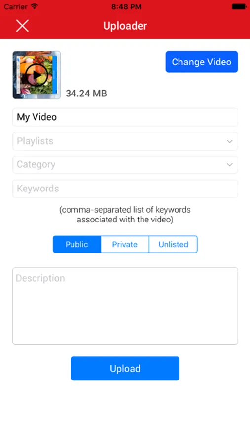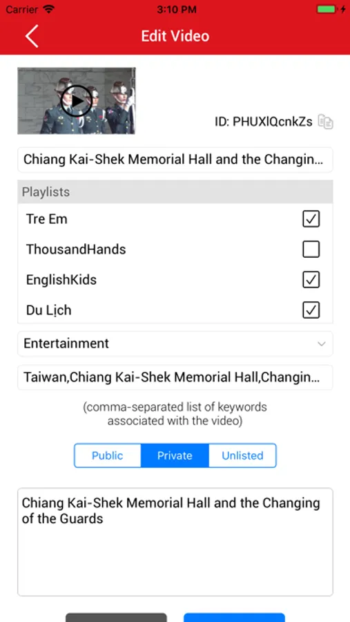 2. Upload video to YouTube with full metadata: Title, Description, Privacy, Playlist, Categories.