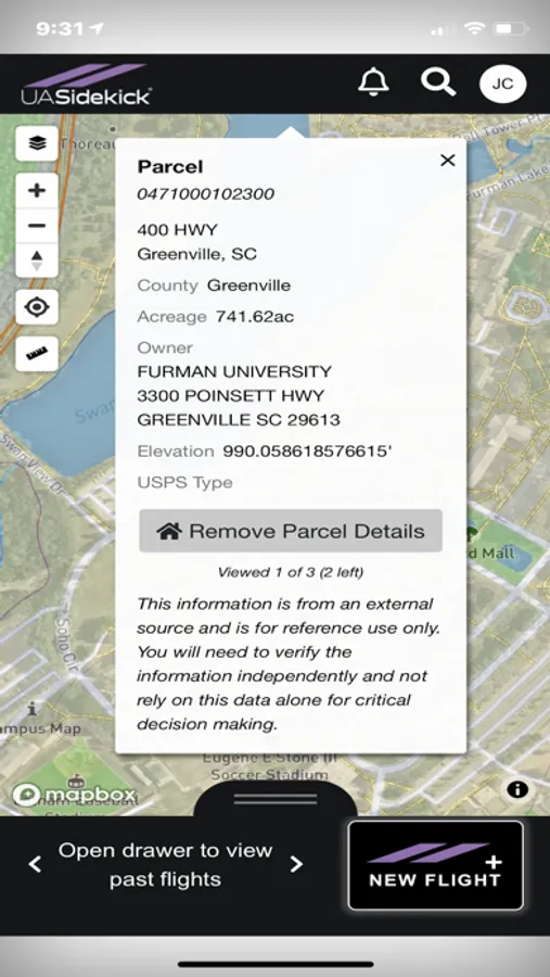 UASidekick has incorporated the feature for parcel data look up which allows the user to select a parcel of land and have the boundary and ownership displayed. Each subscription comes with 15 lookups that renews each month. This feature along with our mapping resource is designed to provide the pilot with situational information not only in the air but on the ground.