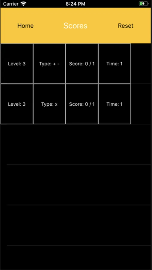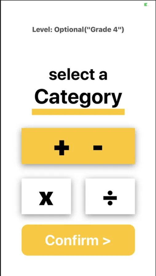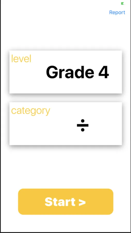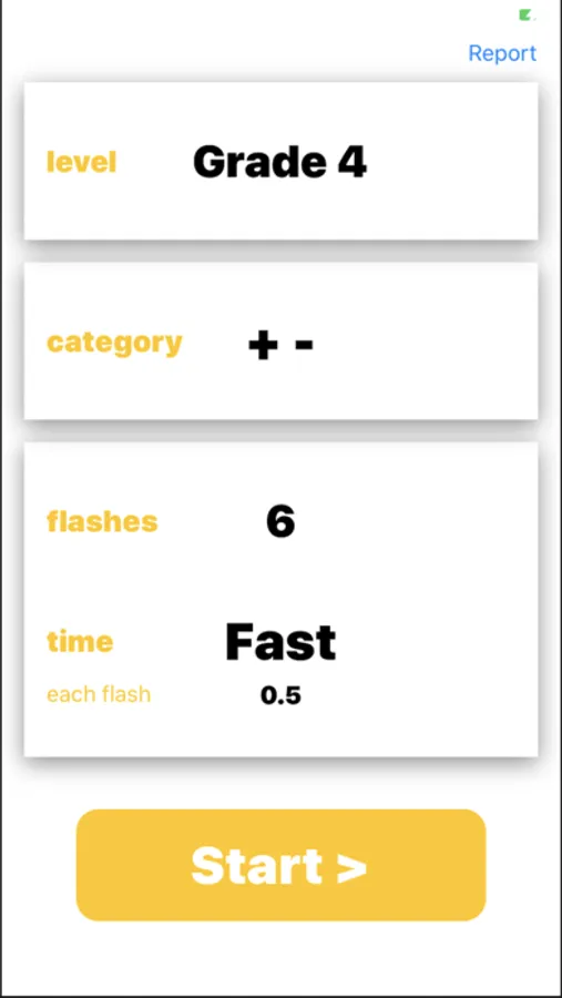 The app features configurations for addition, subtraction, math and division for levels 10 to advanced.