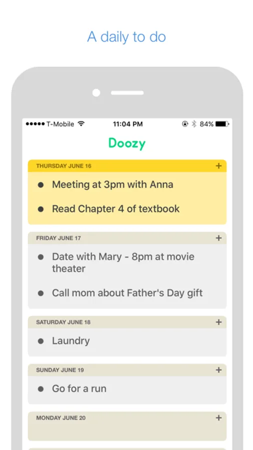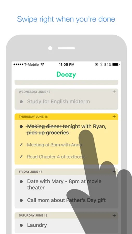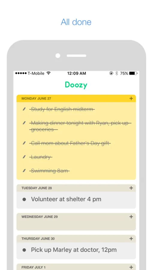 Featuring easy, single screen task adding and editing, Doozy takes your to do lists to the next level. It’s extremely easy to add a new task to the day you want, then a simple, satisfying swipe to mark it as done.