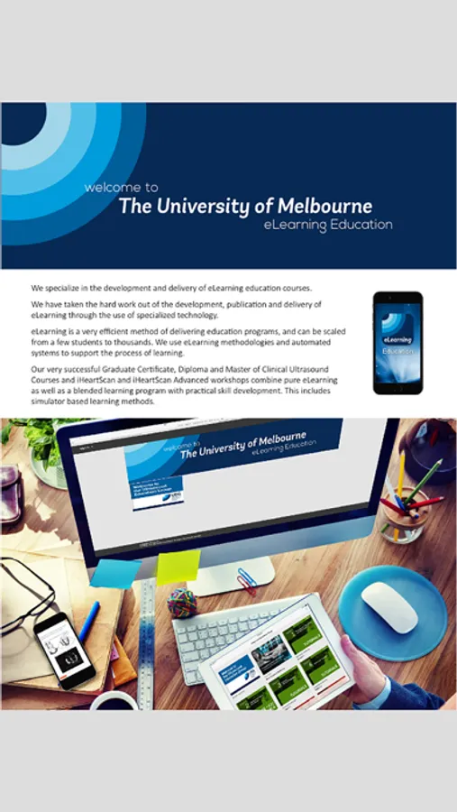 The eLearning Education app has been designed to deliver course materials to students enrolled in the graduate programs of Clinical Ultrasound and of Veterinary Science at The University of Melbourne.