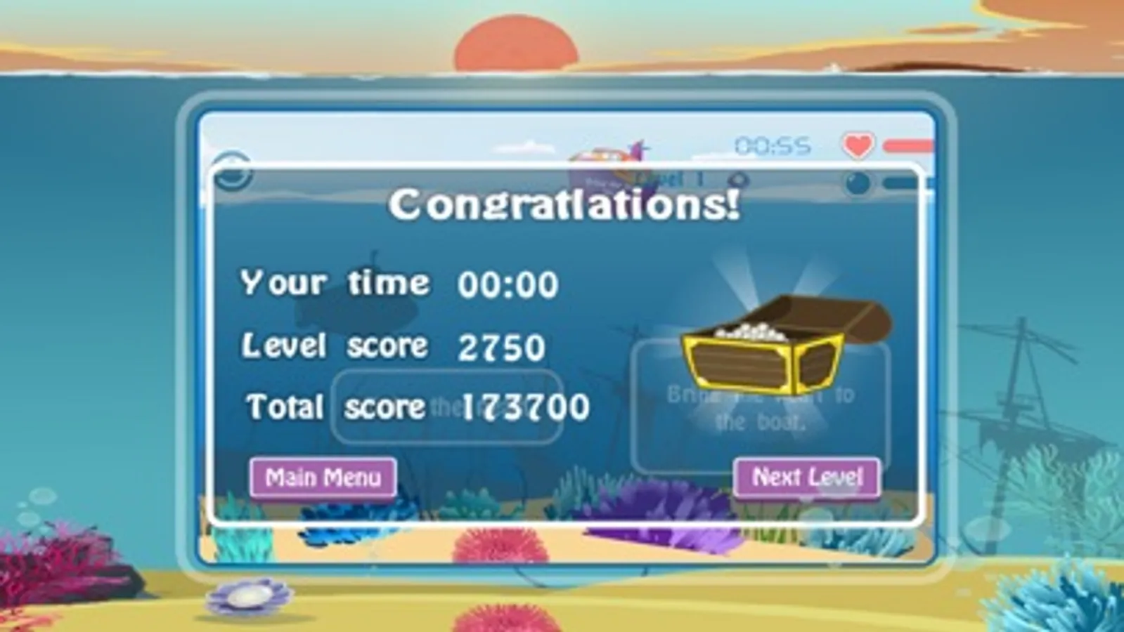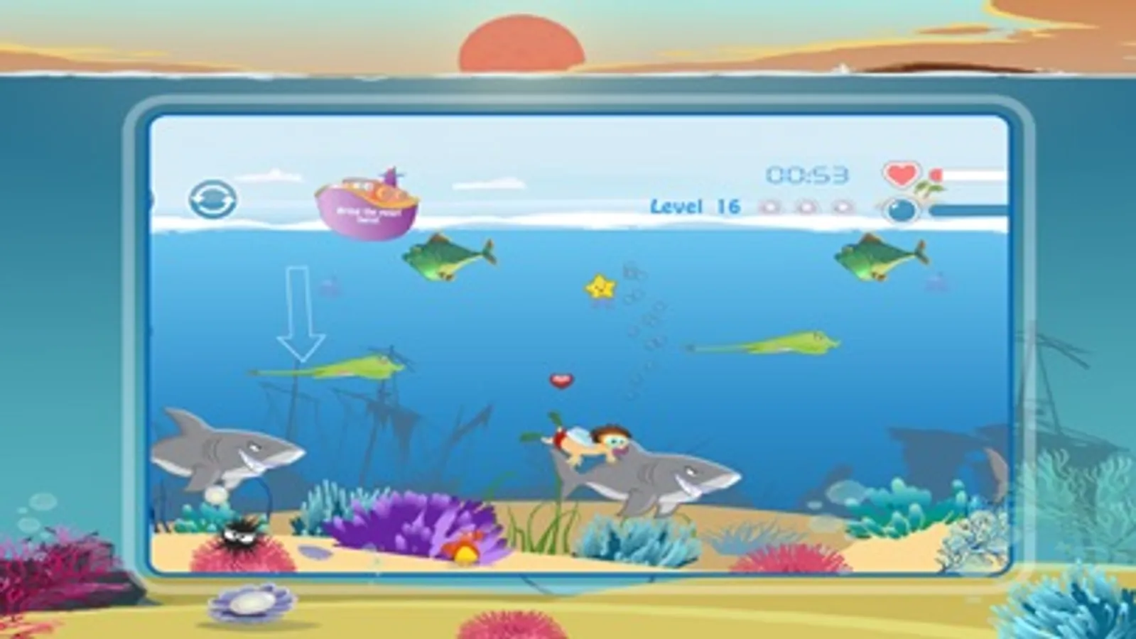 Dive into the great big blue and collect all the pearls and bring it back to your boat. Be careful and avoid those angry fish, electric eel and sea urchins. Collect stars and hearts and air bubbles to help you in your task!