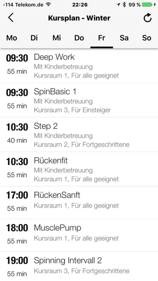 Direkter und aktueller Zugriff auf den Kursplan des Bewegungsforum Nieder-Olm von überall: Für jeden Kurs können Sie Details wie Zeit, Kursbeschreibung, Raum, Bilder und Merkmale einsehen.