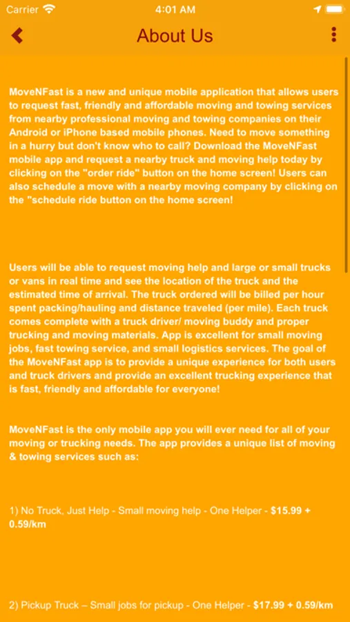 MoveNFast is a new and unique mobile application that allows users to request fast, friendly and affordable moving and towing services from nearby professional moving and towing companies on their mobile phones. Need to move something in a hurry but don't know who to call? Download the MoveNFast app and request a nearby truck and moving help today! Users will be able to request moving help and large or small trucks or vans in real time and see the location of the truck and the estimated time of arrival. The truck ordered will be billed per hour spent packing/hauling and distance traveled (per mile). Each truck comes complete with a truck driver/ moving buddy and proper trucking and moving materials. App is excellent for small moving jobs, fast towing service, and small logistics services. The goal of the MoveNFast app is to provide a unique experience for both users and truck drivers and provide an excellent trucking experience that is fast, friendly and affordable for everyone!