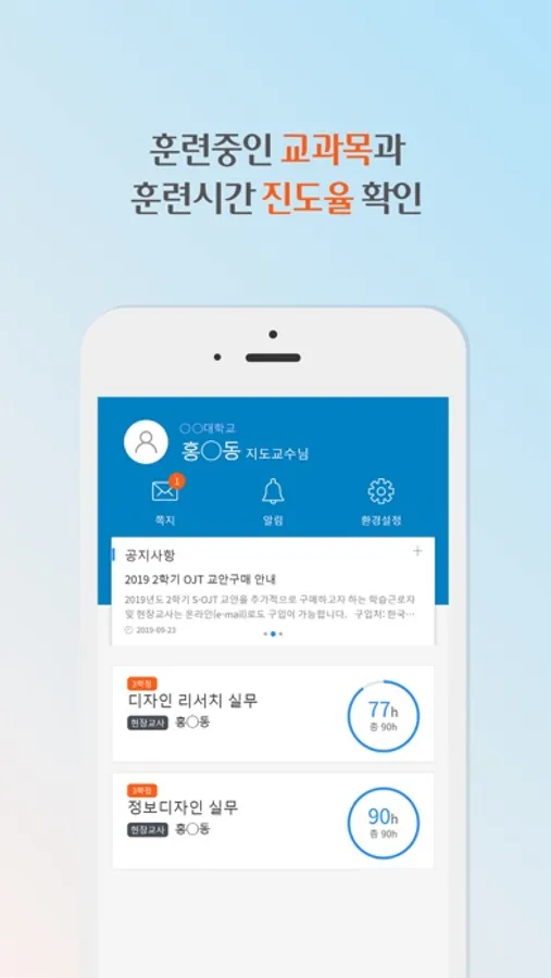PC의 K-Dual LMS 시스템과 동일한 수강과목을 모바일을 통해 확인할 수 있으며, K-Dual LMS 시스템 강의 내의 공지사항 확인, 학습현황, 교육훈련 내용, 쪽지 보내기 등의 다양한 학습활동을 모바일에서도 이용할 수 있습니다.