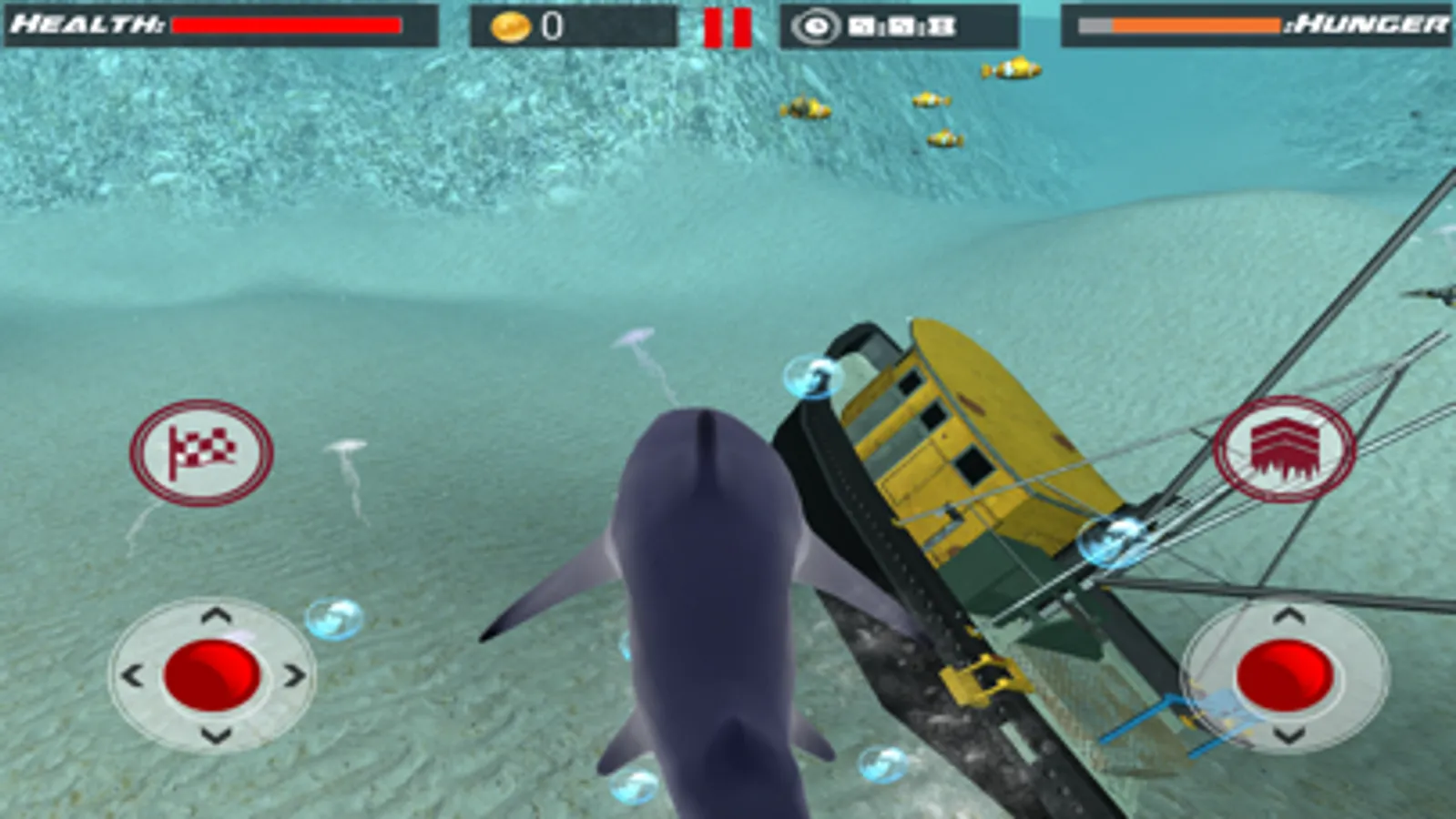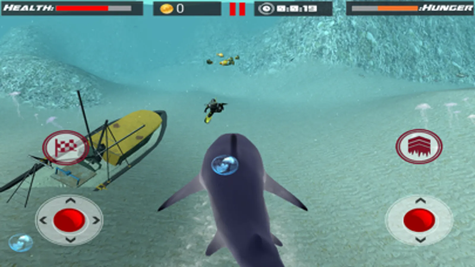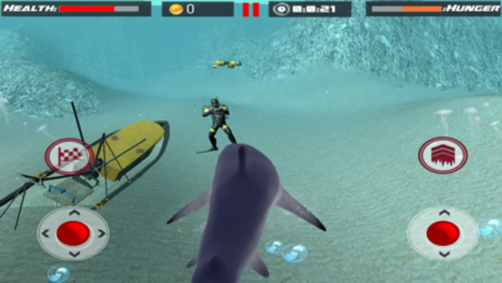 Choose between a variety of sharks looking to satisfy their hunger. Scuba divers will try to shoot spears at you. Hunt down fish like dolphins and eat them to gain energy. Go on an underwater adventure and play the role of the most dangerous predator in this world. Chase and fight hunters on boats or they will shoot you to be fearless and attack them. This shark takes you in the dangerous world of oceans, Take revenge for smaller fish sharks by killing spear hunter that is scuba divers.