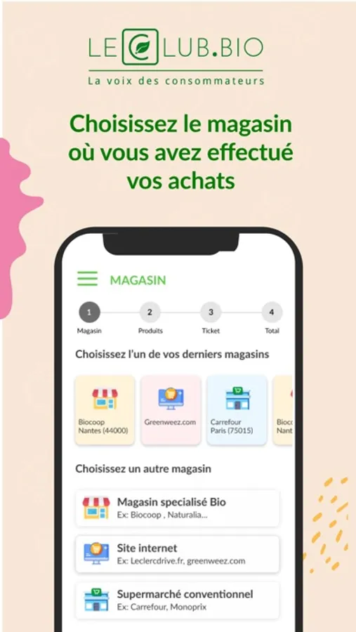 - Saisissez le magasin dans lequel vous êtes allés faire vos courses (Biocoop, Naturalia, la Belle Vie et autres enseignes)
