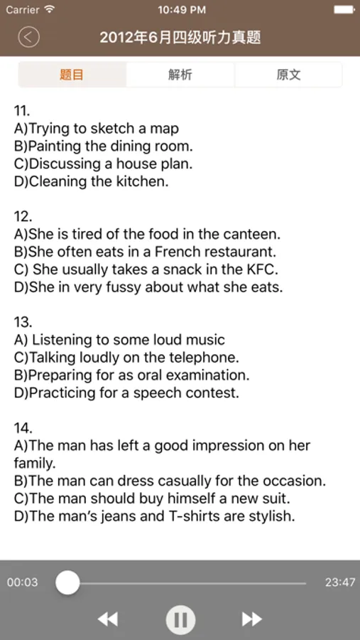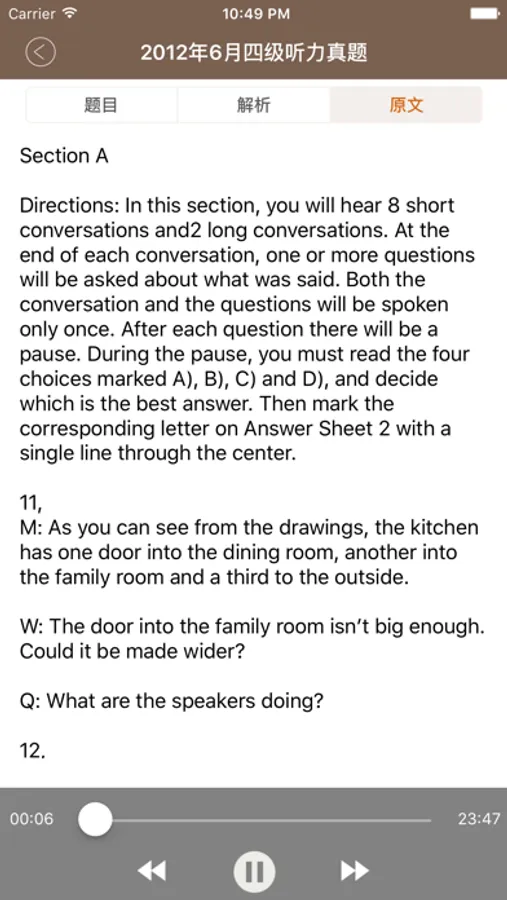 主要面向准备参加大学英语四级(CET-4)考试的考生,同时也可作为托福(TOEFL)、雅思(IELTS)、英语专业考试、研究生考试、PETS、自学考试及广大英语爱好者训练听力的参考。真题仍旧是最为重要的练习材料。建议将历年的真题反复听,仔细听,连续听至少三轮,将没听清楚,不能确定,没及时反应出来的地方标出来反复听,对照参考答案认真分析。将听力中的短对话研究一下,认真把短对话默写一遍,如果你能认真做,你的听力水平已经有了很大的进步。希望大家四级考试顺利通过。