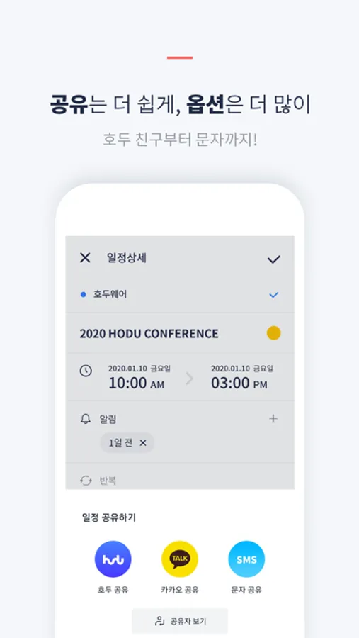 • 원하는 방법으로 호두 일정 공유(호두, 문자메시지, 카톡)