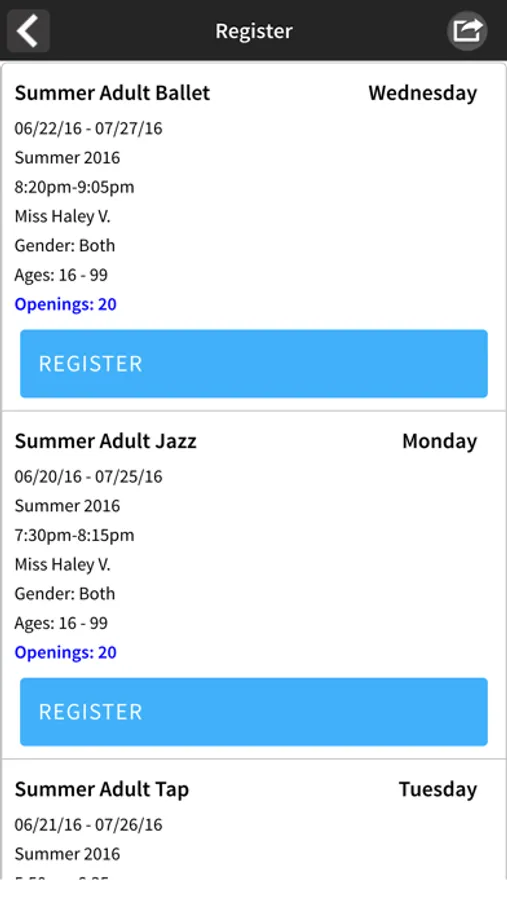 - Have a class in mind? Search by program, level, day, and time. You can register or even put yourself on a wait list.