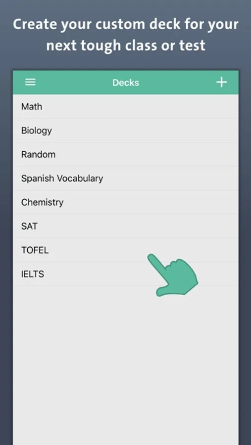 [+] Make your own flashcard decks for IELTS, TOFEL, SAT, ACT, AP, vocab, math, spanish, biology, anatomy, chemistry & much more!