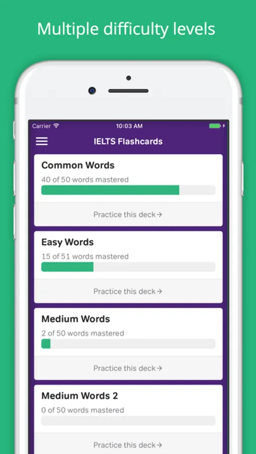 - Decks of flashcards for multiple difficulty levels; easy, intermediate, and advanced