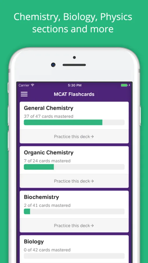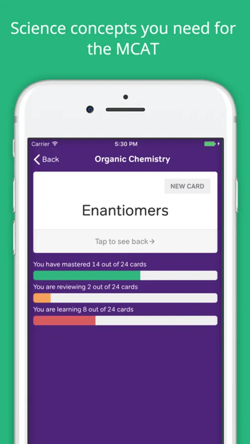 Get ready for the Medical College Admissions Test (MCAT) with this research-based MCAT Flashcards App. Study for the MCAT by quizzing you on the key concepts tested: General Chemistry, Organic Chemistry, Biochemistry, Biology, Physics, Psychology and Sociology. Take your studying on the go with MCAT Flashcards that are accessible without WiFi.