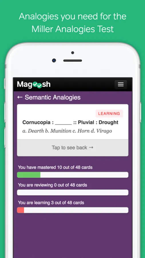 This app gives you free access to all of Magoosh’s Miller Analogies flash cards. Sign in with a Magoosh account (or create a new one) to save your progress to the web.