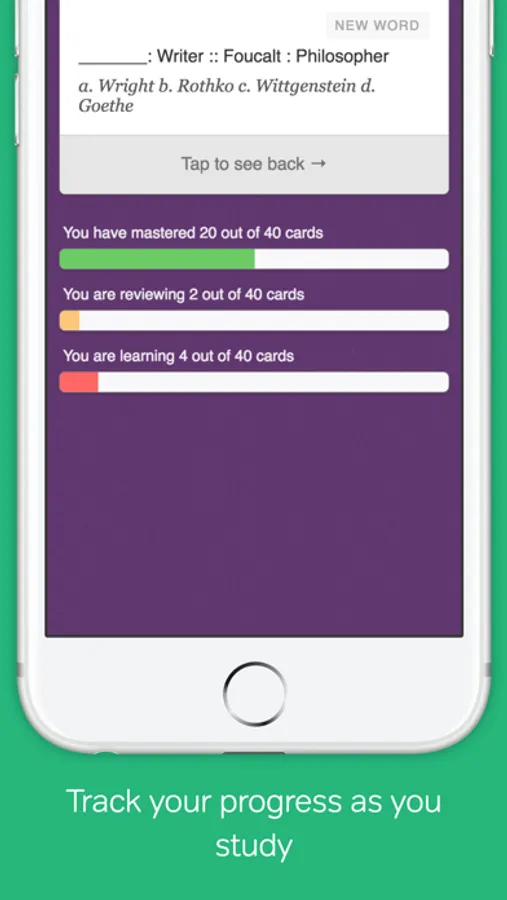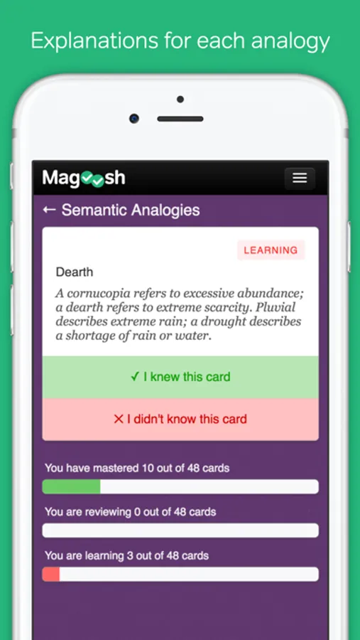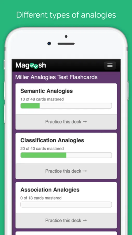 Academic research has found that memories are formed by repeated exposure to new information, so Magoosh’s flashcard app uses a spaced repetition system. Analogies you are learning will reappear frequently (occurring less frequently the better you know them) and analogies you already know won’t be repeated.